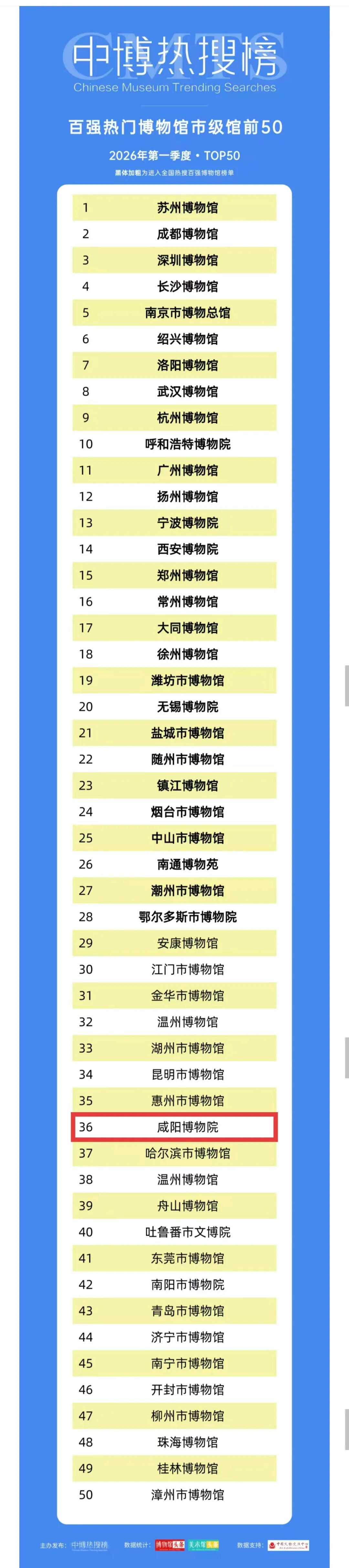 近日,由中博热搜榜主办的2026年第一季度全国热门百强博物馆榜单正式发布,咸阳博物院凭借深厚的文化底蕴、扎实的工作举措、优质的公共服务,成功跻身全国热门百强博物馆市级馆TOP50。
