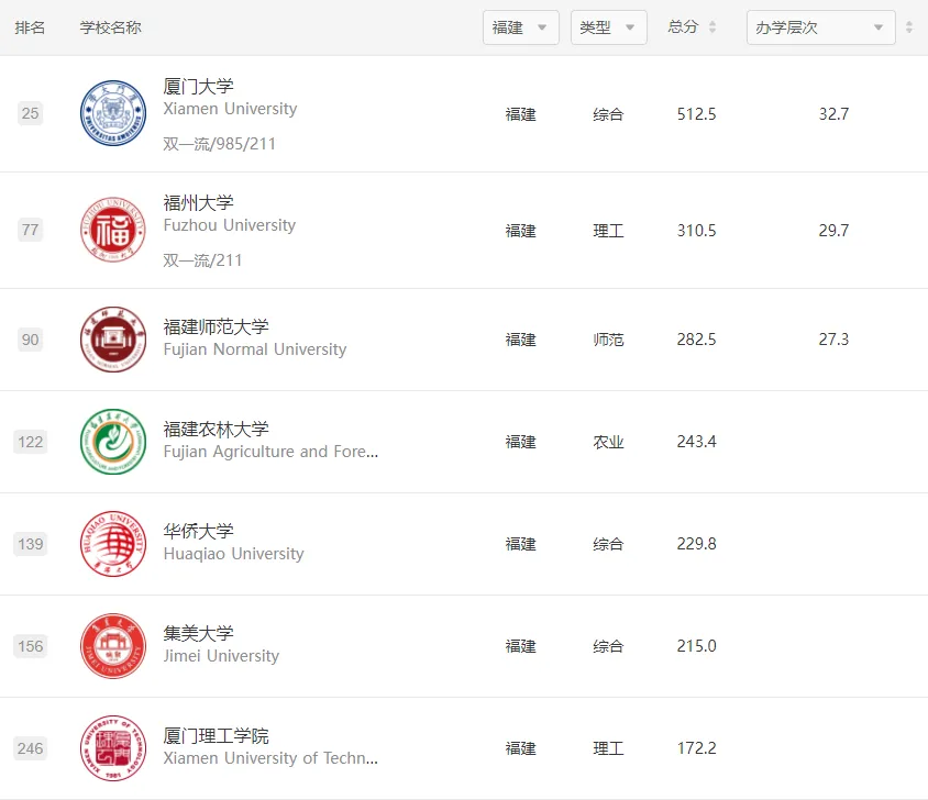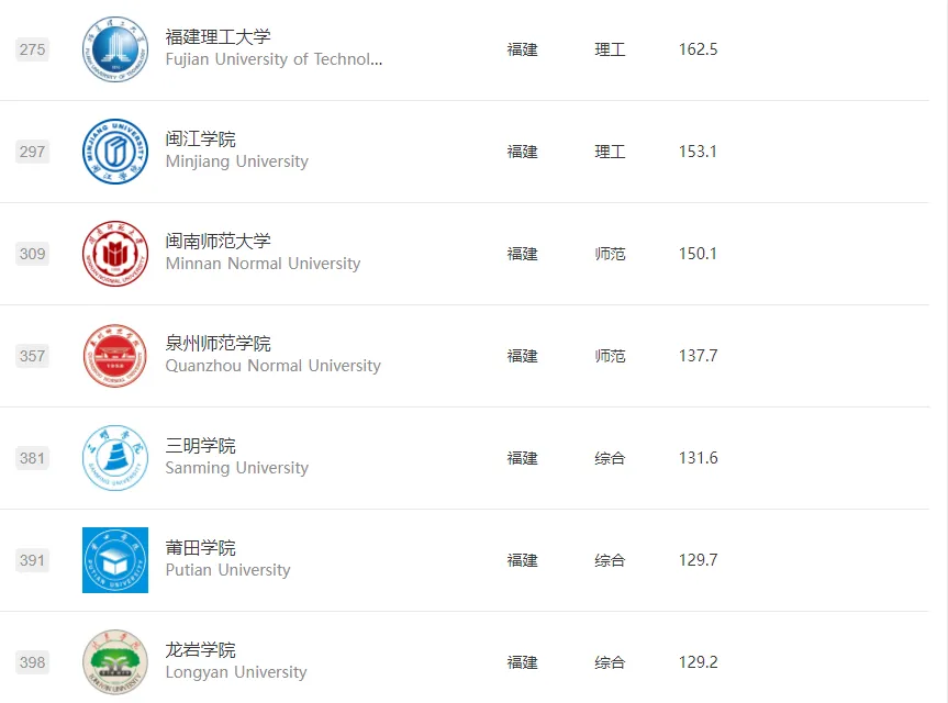 在民办高校主榜中,福建共有9所学校上榜,其中阳光学院位列第25名,排名较去年大幅提升;泉州信息工程学院也于今年将排名位次提升至第35名。闽南理工学院(第60名)、厦门华厦学院(第88名)、厦门工学院(第97名)、仰恩大学(第100名)也纷纷入围民办高校主榜前100名。