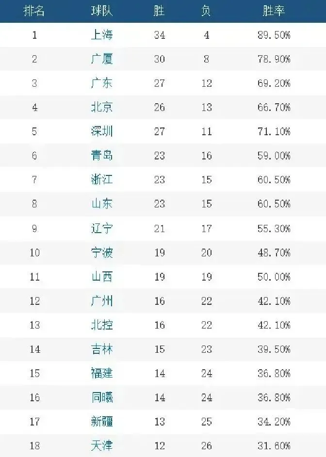 附带的分档能看得更直观一些:1—5位分别是上海、广厦、广东、北京、深圳;6—10位依次是青岛、浙江、山东、辽宁、宁波;11—15位则是山西、广州、北控、吉林、福建,而16—20位同曦、新疆、天津、江苏、四川基本已经无缘季后赛,只能把注意力放到练兵和下一季的阵容调整。