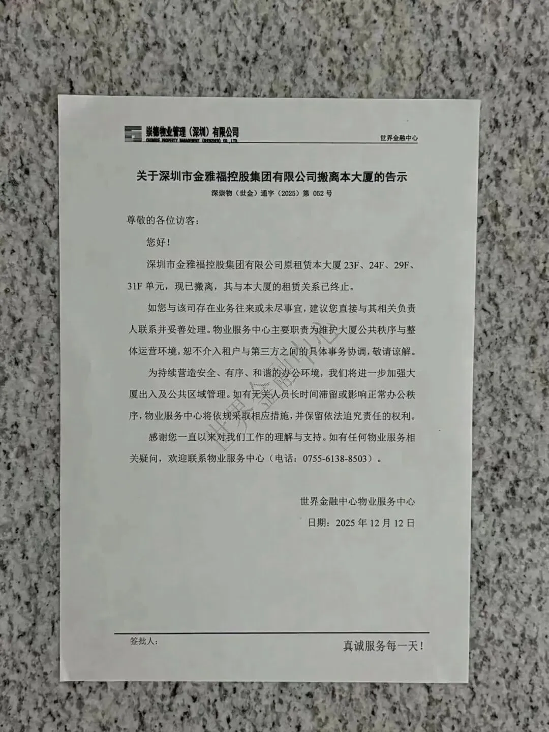 危机爆发后,金雅福的应对尽显狼狈。先是董事长黄仕坤在内部会议上恳求投资者“多给一点时间”,随后便杳无音信,从香港辗转至境外,深圳公安已启动全球追逃程序。集团总部人去楼空,物业贴出搬离告示,办公室只剩废弃杂物,曾经的黄金巨头瞬间沦为空壳。截至目前,深圳公安已抓获黄仕峰等核心嫌疑人,查封、冻结涉案房产、车辆、股权、黄金实物等资产,但面对70-80亿的涉案规模,追回资金的难度极大。而投资者提出的展期、转股等方案,要么遥遥无期,要么关联公司估值存疑,根本无法挽回损失。
