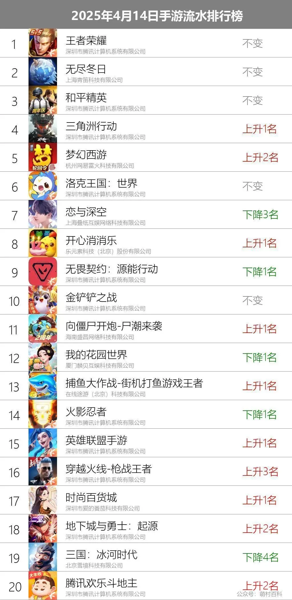 4月14日手游流水排行榜。数据来源于iOS中国区畅销榜数据,数据节点为2026年4月14日22:00。