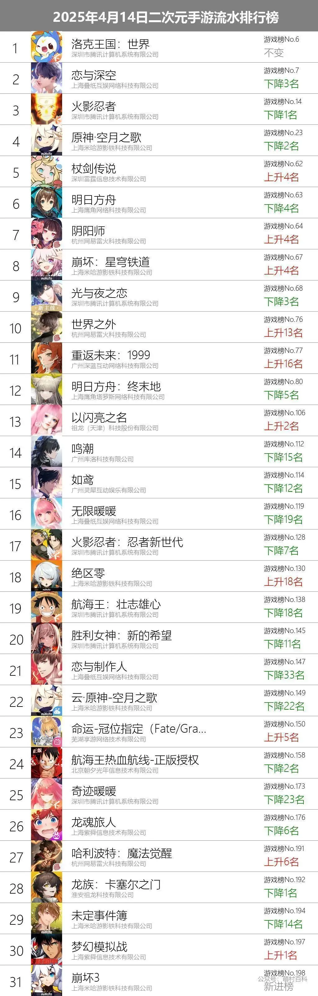 4月14日二次元手游流水排名榜单(文字版)