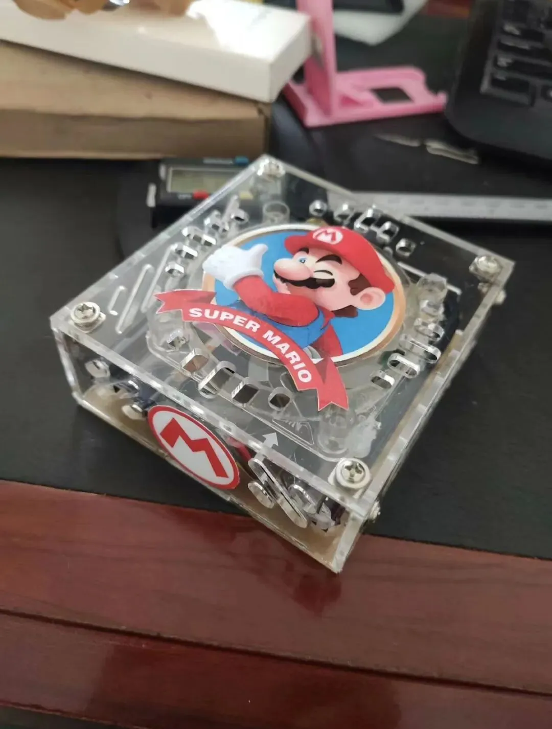 而除了透明亚克力版本外,还可以改造成这种红色版本,跟马里奥的主题色对应了。不过这可不是喷漆处理,而是采用了红色的亚克力板,再贴一个马里奥的贴纸。从实施难度来说,这种比喷漆要简单方便,同理还可以制作蓝色、黑色等各种颜色的版本。