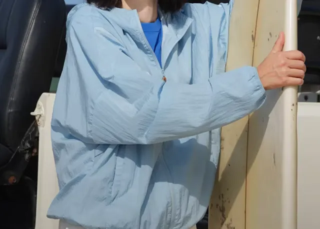 「外观设计」:版型修身不臃肿,能修饰身材线条,领口设计贴合颈部,减少防晒盲区。