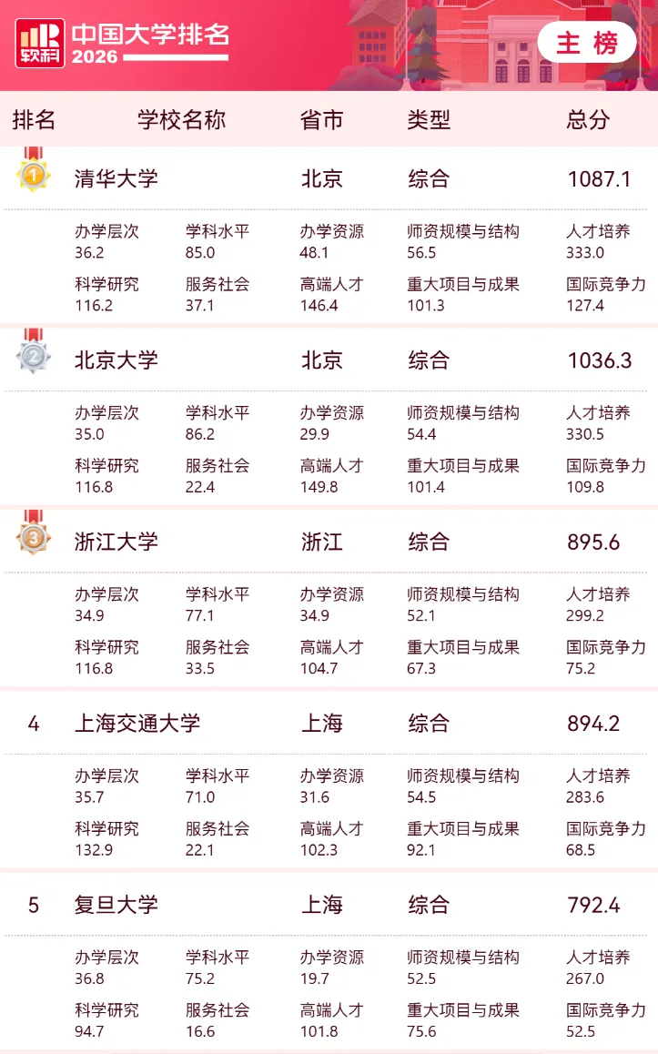 今天4月15日,软科又一年一度发布了“2026软科中国大学排名”。排名对象是中国1000多所本科层次的高校。说到大学排名,因为教育部不发布官方排名,所以是中国民间最为津津乐道的话题,除掉公认的清北前二,其他全国第三名有至少五所以上学校,全国前十,至少有二十来个互相不重复的版本。