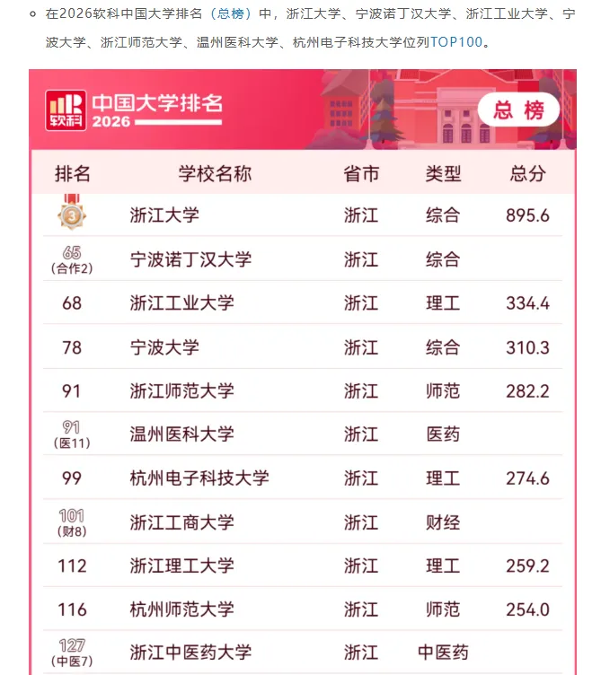 顺带提一嘴,软科的榜单为什么受各类大学欢迎?是很多院校分在专业榜单,在主榜只有个预估排名,但又不占主榜位置,那这样全国前100的学校就有接近200个了,各个大学都开心,比如出了名的浙江断档高教体系,唯一一所211浙大以后有七所双非省重点都能位列top100,这样感觉浙江高等教育也不差