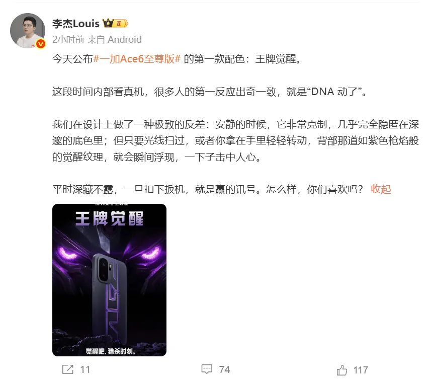 前几天红米k90 max在预热,一加也不甘示弱,近期也开始预热竞品,一加ace 6至尊版的外观得到曝光,相机模组是靠左矩形设计,在外壳上做了渐变灯效的设计,看起来更有科技感,同样是天玑9500处理器+165Hz高刷,如果追求游戏体验的话可以等等。