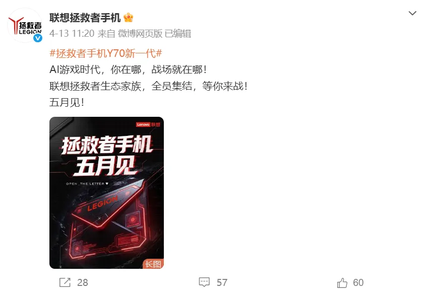 联想上一代发布的电竞手机,还是在2022年,时隔四年联想重启电竞手机,命名为拯救者手机Y70新一代,将会在五月发布,号称“为战而生”。