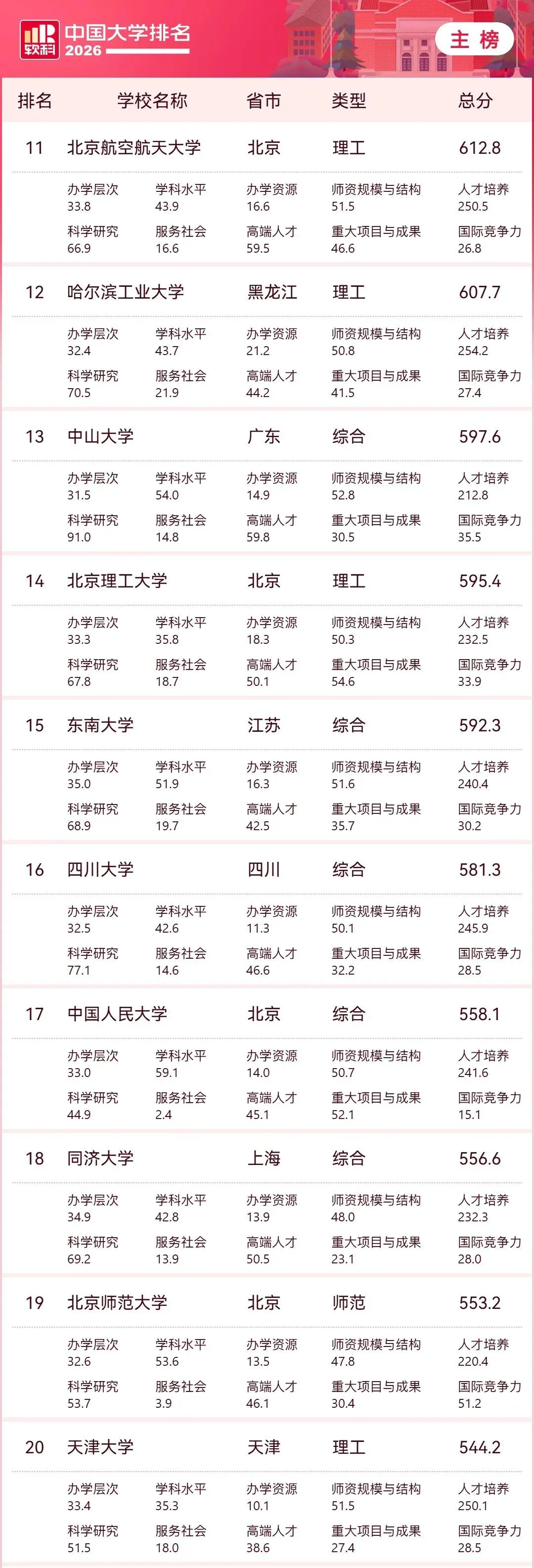 2026软科大学排行榜,清北浙包揽前三.天大南开排20、21.天津前三:天大、南开、医科大.