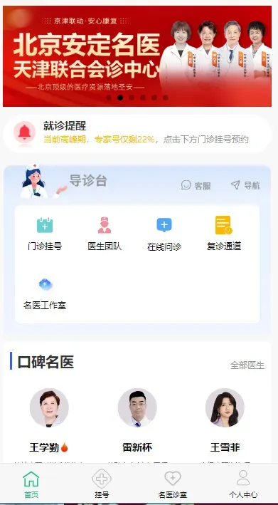 2、小程序挂号:患者可以搜索小程序“天津圣安医院预约挂号”。挂号界面简洁明了,患者只需跟进自己情况选择相应医生,即可完成挂号预约。