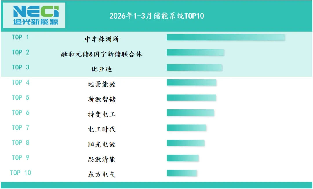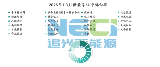 据追光新能源汇总统计,26年Q1国内储能系统中标容量47491MWh,环比25年Q4增长22.4%,同比25年Q1下滑25.3%,其中1月中标5161MWh,2月中标10997MWh,3月中标31333MWh,系统中标基本为交流侧。Q1最大中标项目为中国华电集团有限公司2026年磷酸铁锂电化学储能系统框架采购,总共12GWh,由电工时代、中车株洲所、特变电工、东方电气、国电南自、华电科工、思源清能7家集成商中标。Q1储能系统中标项目主要集中在山西、山东、宁夏、内蒙古、河北、广东、甘肃等地,山西、甘肃、河南、内蒙古、广西、山东出现超GWh的储能项目EPC中标,在25年年底抢装潮过后,1-2月中标项目明显减少,但是3月整个中标量级出现明显提升,主要为26年框采项目的中标,接近历史25年8月高位,显示国内旺季将会提前到来,整个的储能项目将会站上一个新的台阶。价格方面(以3月为基准):2-4小时项目,价格落在0.49-0.63元/wh之间,均价在0.56元/wh,本月仅中国电建1个GWh级的4h储能项目,价格相对稳定。2026年Q1中车株洲所第一,进入前十的系统集成商还有融和元储&国宁新储联合体、比亚迪、远景能源、新源智储、特变电工、电工时代、阳光电源、思源清能、东方电气。Q1整体以交流侧为主,超GWh项目中标较少,电芯价格在需求的支撑下仍有上行走势,预计后续招投标热情不减。「2026Q2 Tier 1 ESS Source NECI」