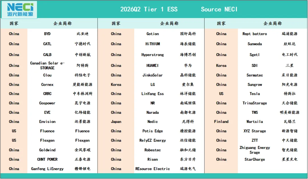 NECI has carefully selected 39 ESS from over 300 global suppliers to enter the 2025Q4 Tier 1 ESS. The main references for NECI is the shipment scale of the manufacturers, the stability of system operation, financial health, global brand influence and after-sales response speed。为更好促进储能行业的信息交流,扫描添加小编微信,即可加入“追光全球储能群”,群内分享全球储能行业最新信息及热点分析,更多精彩,不容错过~