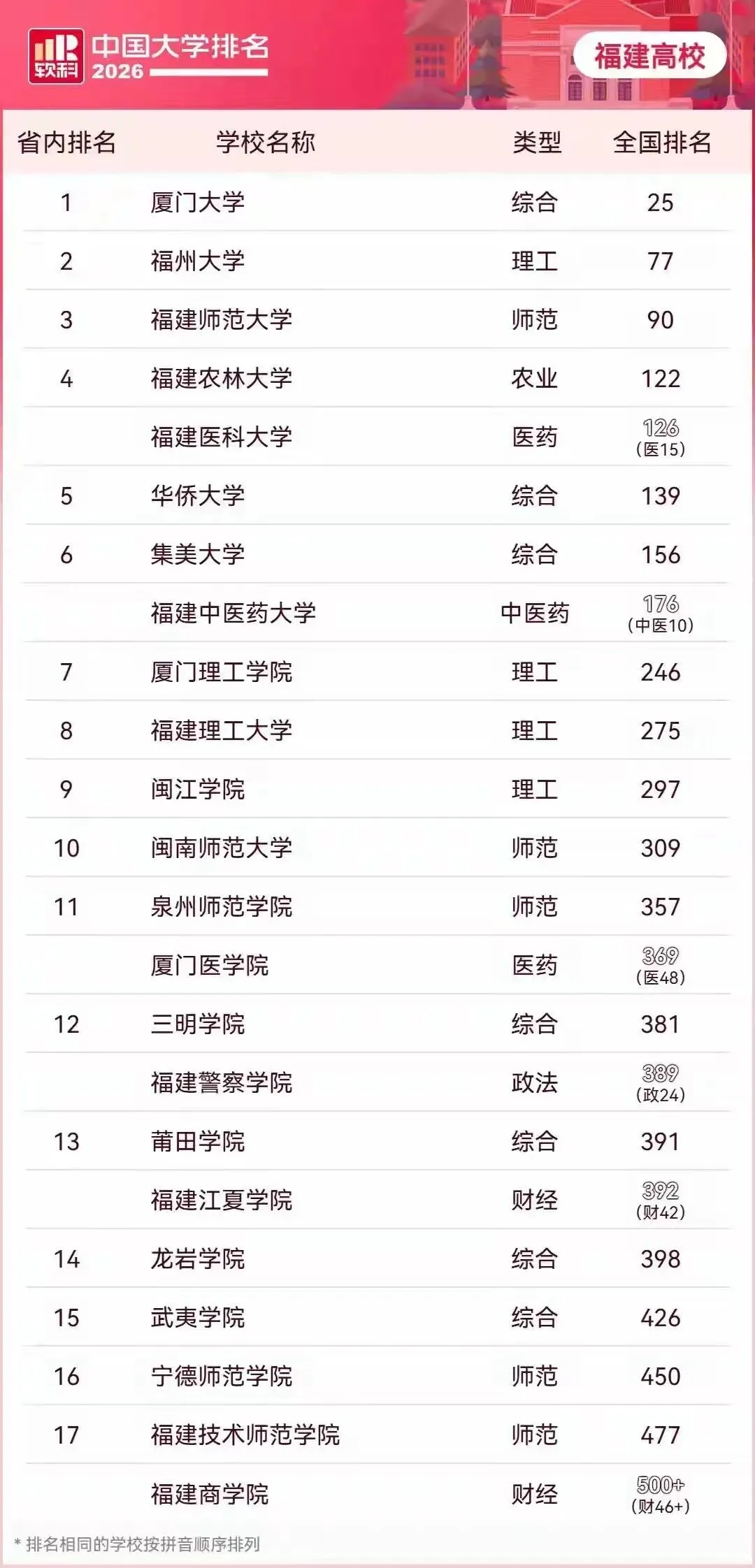 在中国大学排名总榜中,福建共有23所学校入选,具体排名如下↓