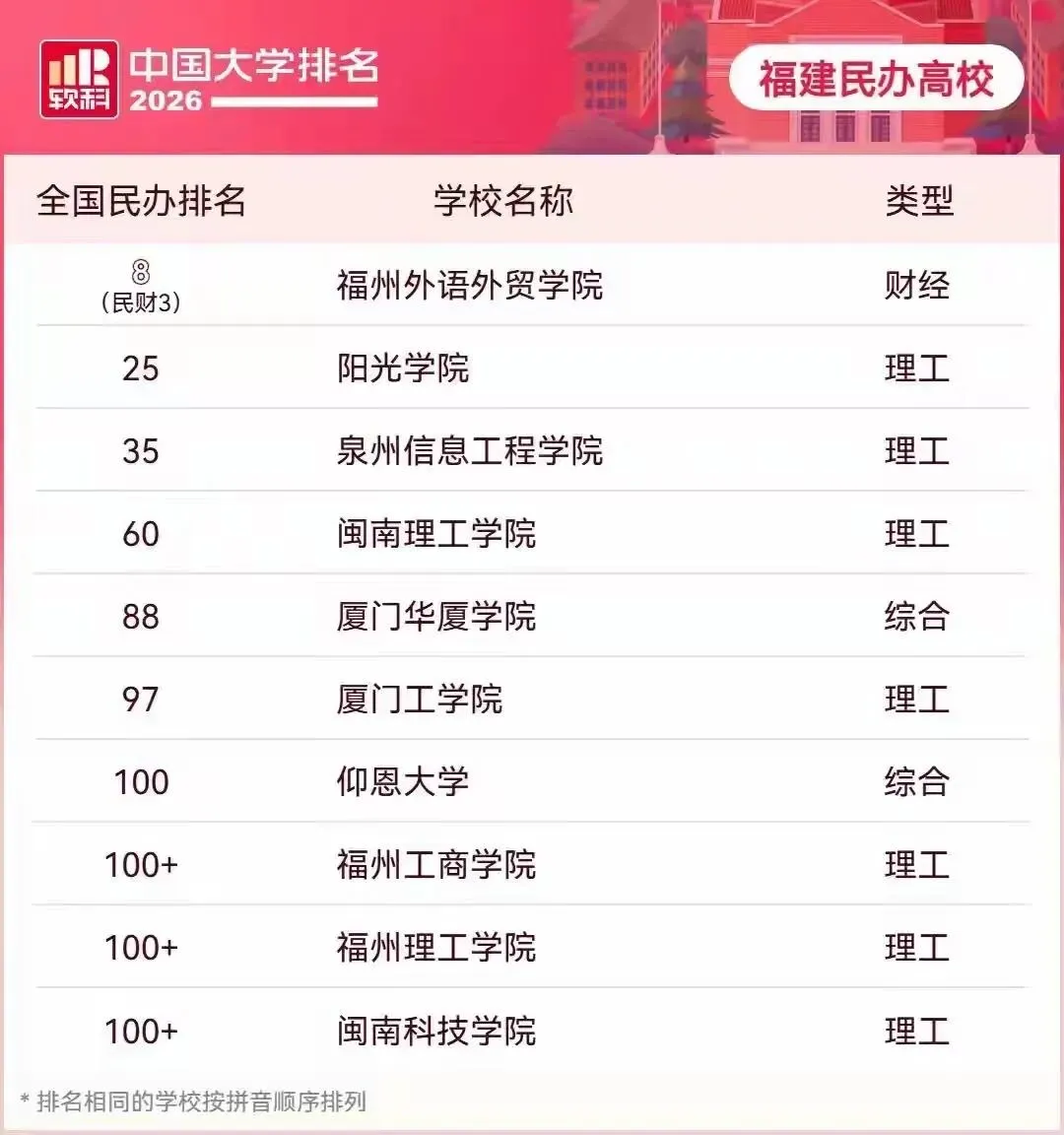 在民办高校主榜中,福建共有9所学校上榜,其中阳光学院位列第25名,排名较去年大幅提升;泉州信息工程学院也于今年将排名位次提升至第35名。闽南理工学院(第60名)、厦门华厦学院(第88名)、厦门工学院(第97名)、仰恩大学(第100名)也纷纷入围民办高校主榜前100名。