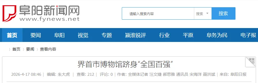 界首市博物馆跻身“全国百强” 4月14日,由中国文物交流中心指导、博物馆头条统计发布的2026年第一季度“中博热搜榜”揭晓。界首市博物馆位居全国百强热门博物馆新开馆热度第6名、全国百强热门博物馆区县馆第19名,综合影响力稳居全国前列。