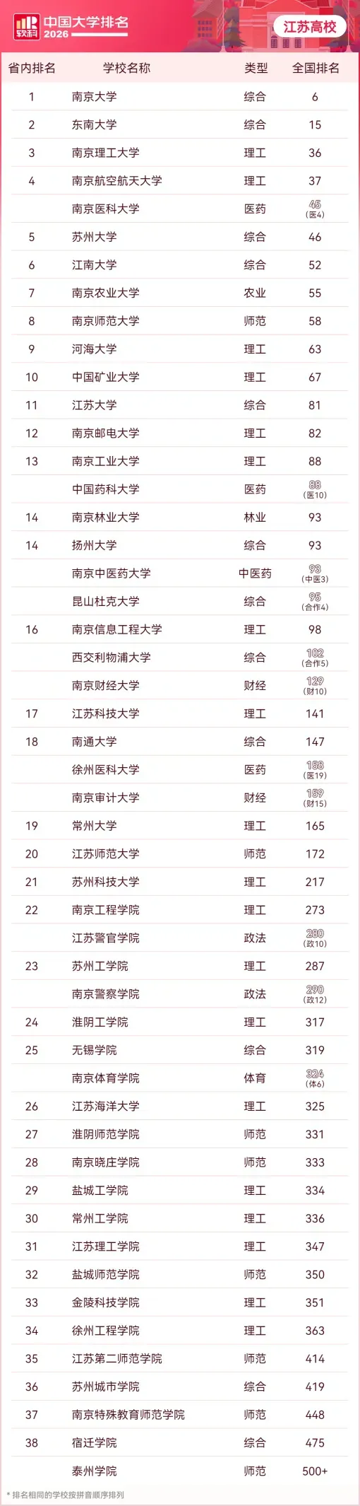 4月15日,高等教育专业评价机构软科正式发布“2026软科中国大学排名”。江苏共有50所高校荣登全国总榜,上榜数量稳居全国第一。