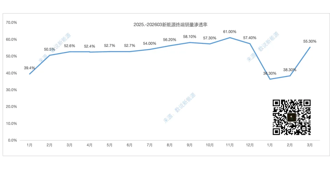 3月乘用车市场新能源渗透率55.3%,相较上月(38.4)大幅上升,随着部分车企新车的发布以及地方区补出台,新能源汽车的是市场整体热度正在逐步恢复当中。