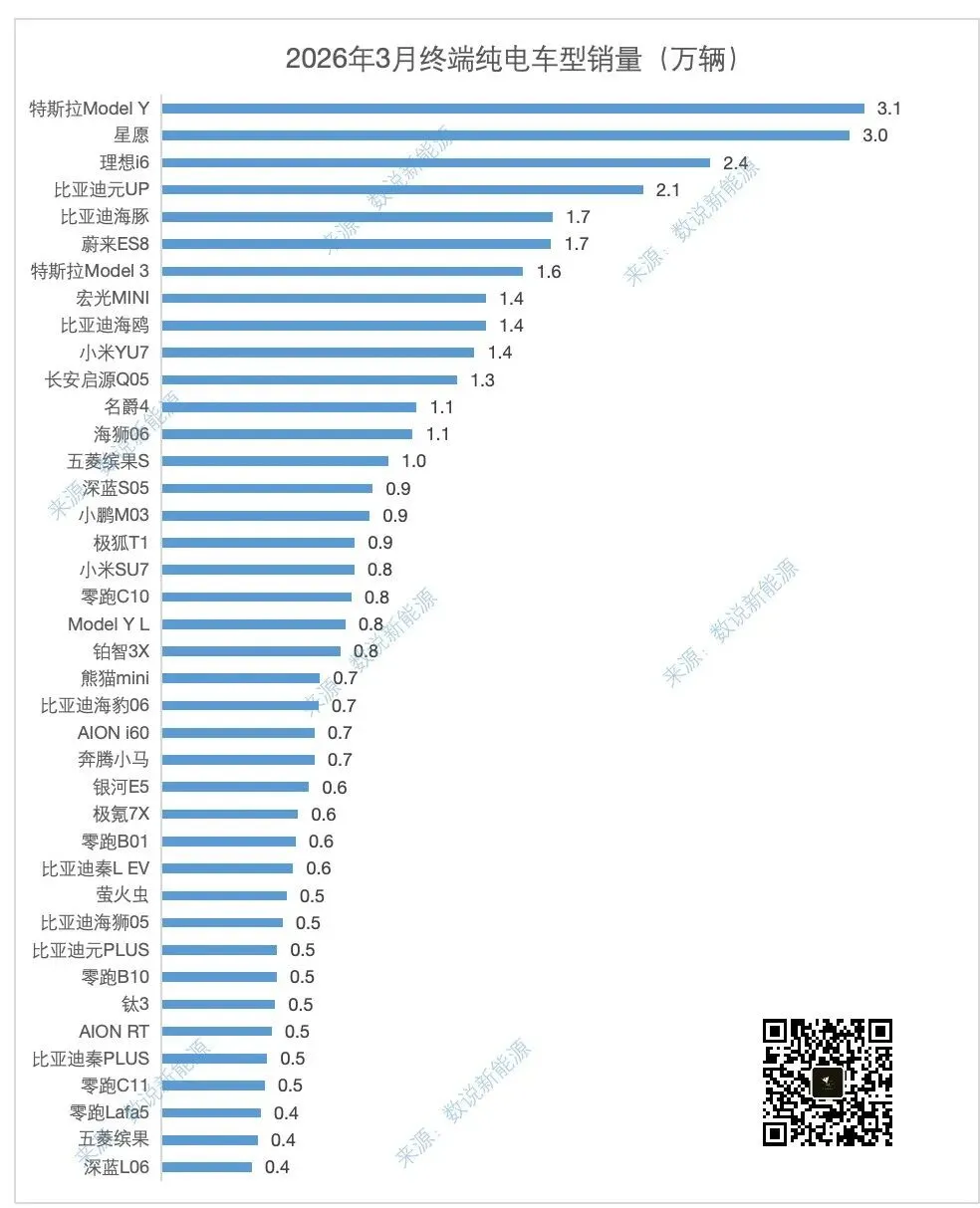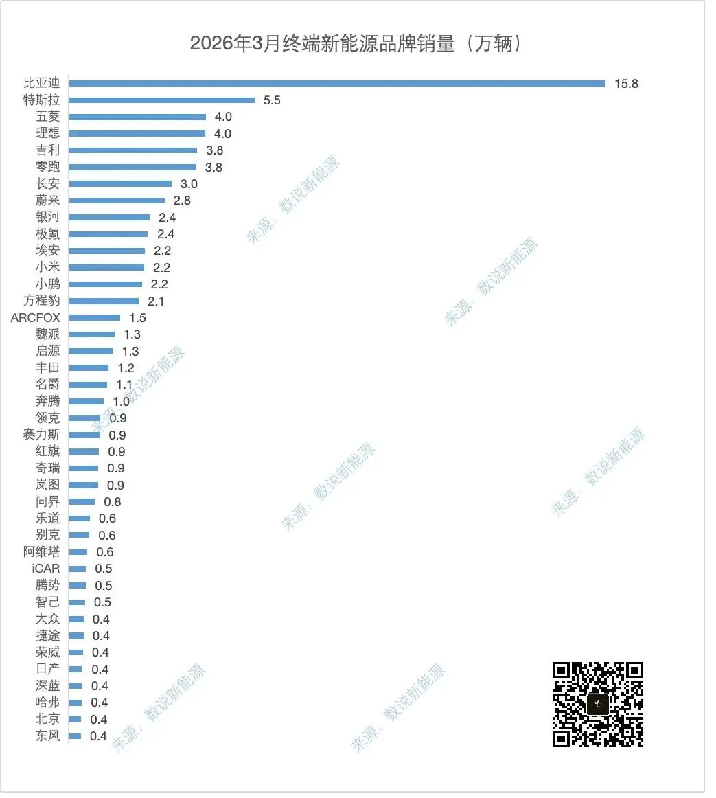 春节后燃油车零售表现弱于新能源车的历史规律再次延续,3月燃油车国内零售同比下降16%,纯电动市场零售同比下降12%,增程同比下降6%,插混同比下降24%,随着消费者逐步适应新能源车的税收正常化,新能源市场有望逐步重回正增长轨道今年3月属春节后重归新能源车主导消费阶段,新能源车国内零售渗透率51.5%,出口渗透率50.2%,表现是较好的三、品牌榜