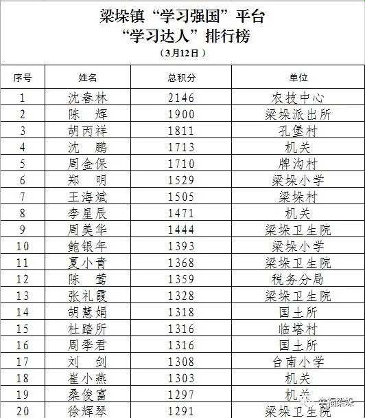 3、请各基层党组织管理员每天上午10:00前,通过梁垛镇学习强国平台建设工作群向镇宣传办报送学员积分排行榜截屏图片(注明“××村、××部门单位‘学习达人’排行榜”)。另,每周一同时报送近七日本单位学员积分排行榜截屏图片。