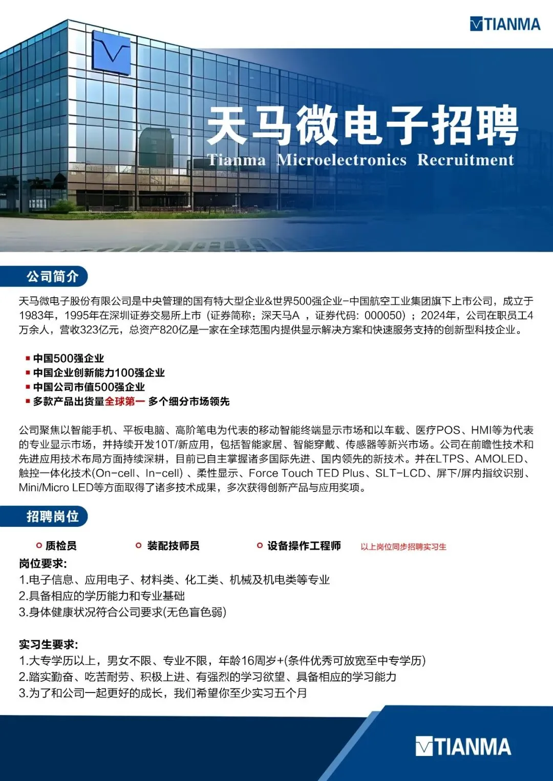 >世界 500 强企业-天马微电子 火热招聘!海量岗位,名额充足