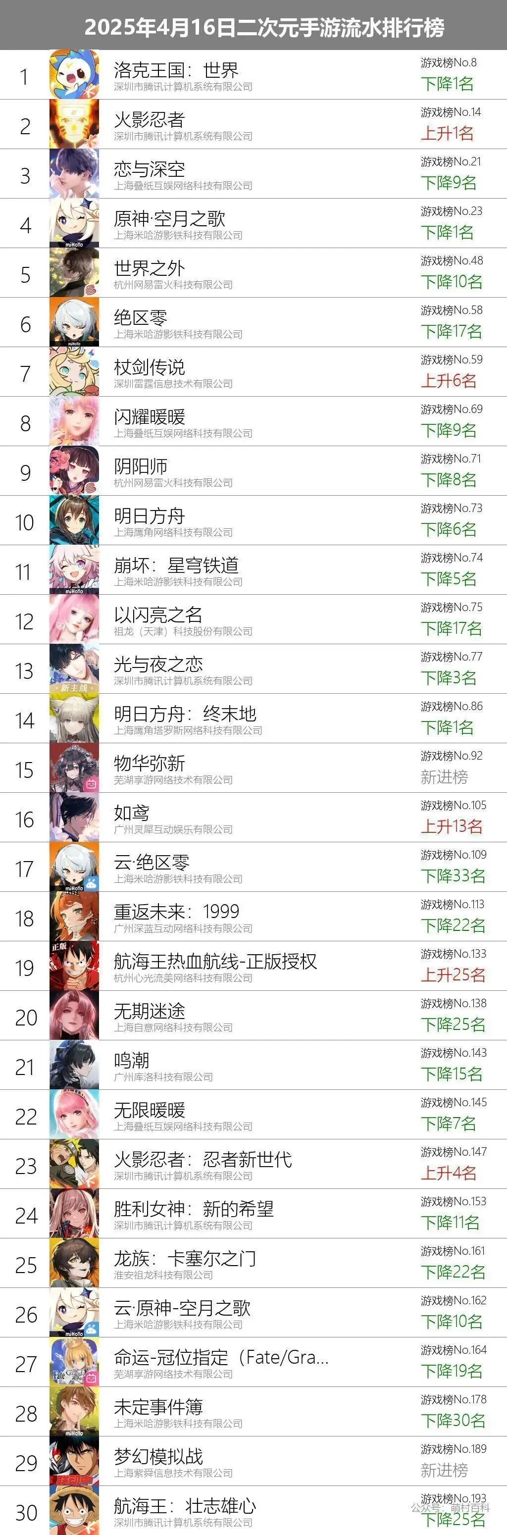 4月16日二次元手游流水排行榜。数据来源于iOS中国区畅销榜数据,数据节点为2026年4月16日22:00。