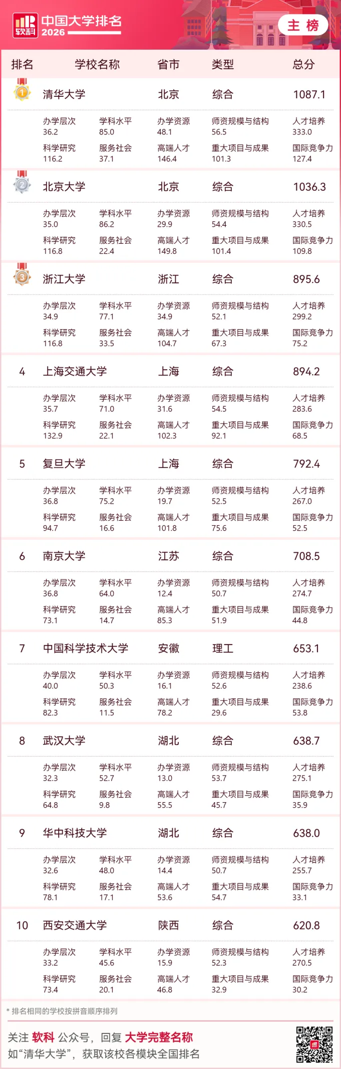 备受瞩目的2026软科中国大学排名正式发布!作为国内最具影响力和公信力的高校排行榜之一,软科排名始终是考生择校与高校自我评估的重要风向标。