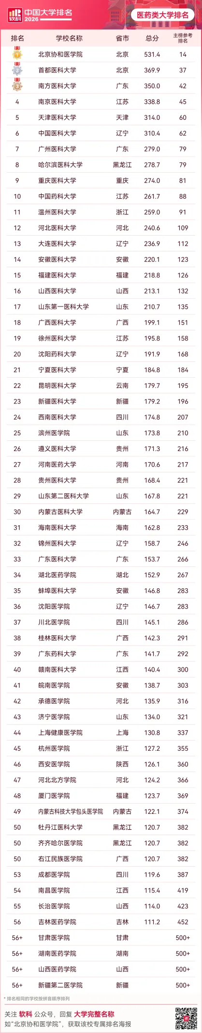 北京协和医学院继续蝉联医药类榜首。作为中国现代医学教育的摇篮,协和凭借顶尖的临床资源和科研实力,始终是无数医学生心中的“白月光”。