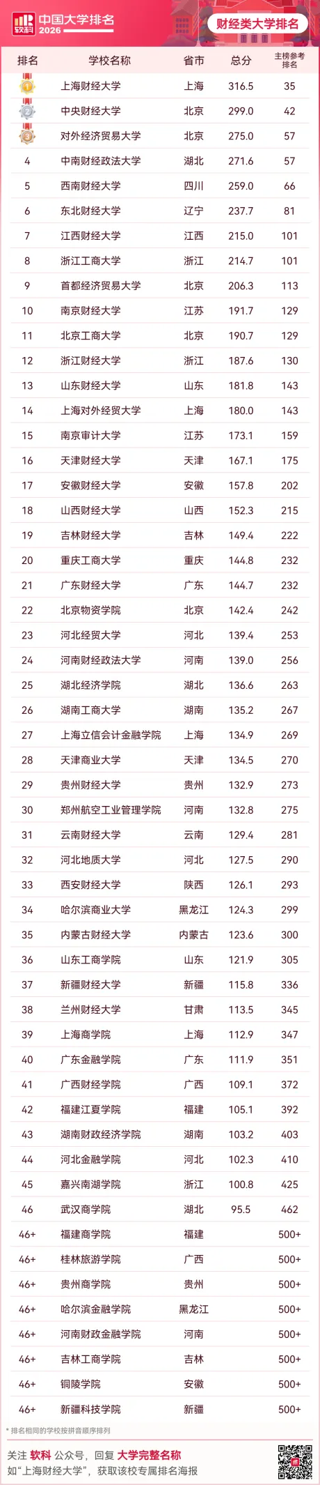 财经类大学的前三名依旧是“两财一贸”的天下:上海财经大学、中央财经大学、对外经济贸易大学这三所高校地处北京和上海两大金融中心,毕业生在券商、银行、咨询公司等领域的就业质量和薪资水平常年位居全国前列,是无数文科高分考生的“梦中情校”。