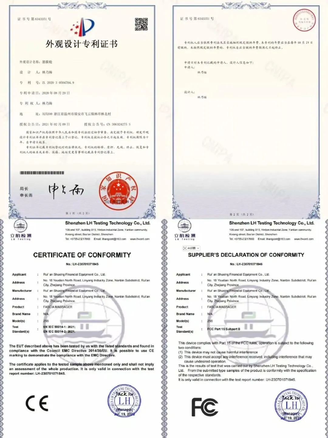 鲸帝筋膜枪的品质经过多重权威认证,拥有国家知识产权局颁发的外观设计专利(专利号:ZL 2020 3 0504704.9),其独特的设计受到法律保护;同时通过欧盟CE-EMC电磁兼容认证与美国FCC认证,符合国际安全与品质标准,能有效杜绝漏电、材质劣质、电磁干扰等安全隐患,使用更放心。