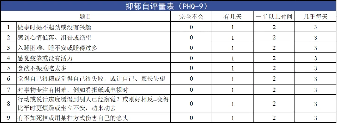 这是临床最常用、最便捷的抑郁筛查量表,重点评估过去2周的情绪状态,既能快速筛查抑郁严重程度,也能用于治疗期间的效果监测。