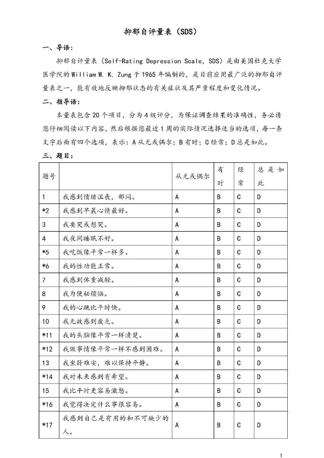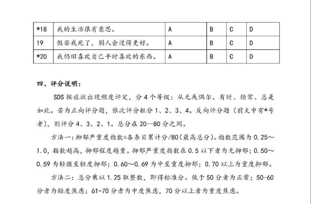 SDS(抑郁自评量表)是应用最广泛的抑郁筛查工具之一,操作简单、耗时短,重点评估过去1周的情绪状态,适合普通人群初步自我筛查,快速判断抑郁倾向。