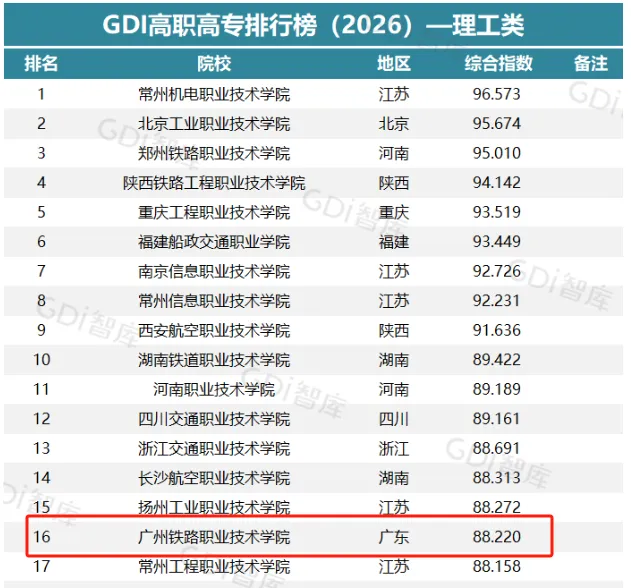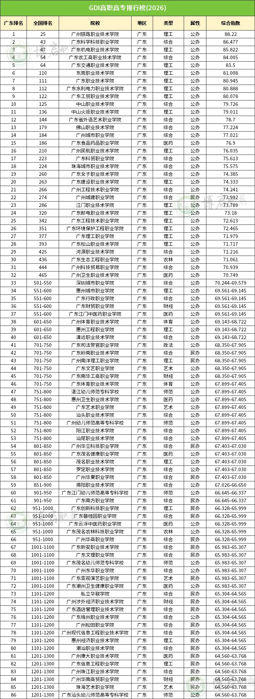 广东共有86所院校上榜,广州铁路职业技术学院以理工类88.2的综合指数跃居全省第一,广东科学技术职业学院和广东机电职业技术学院紧随其后,分别位列第二和第三。