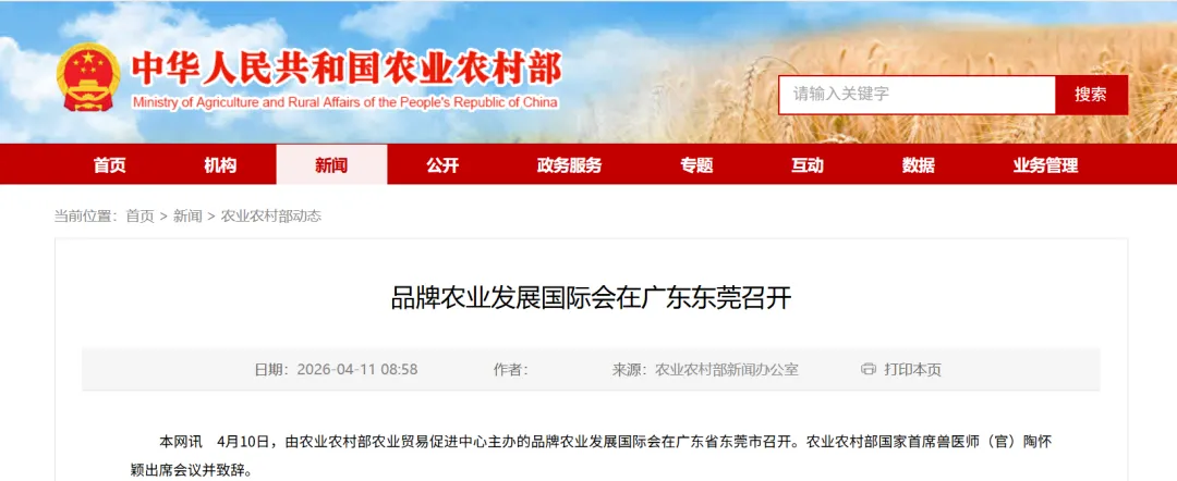 4月10日,由农业农村部农业贸易促进中心主办的品牌农业发展国际会议在广东省东莞市召开。本次会议贯彻落实“十五五”规划纲要提出的“统筹发展科技农业、绿色农业、质量农业、品牌农业,把农业建成现代化大产业”,紧扣“推进品牌农业国际化促进优品优价”主题,旨在汇聚全球智慧与实践,搭建集政策研讨、品牌推介、经验交流与资源对接于一体的国际会议专业平台。农业农村部国家首席兽医师(官)陶怀颖、广东省政府副秘书长刘华伟、联合国粮食及农业组织驻华代表处代表卡洛斯、东莞市市委副书记梁杰钊、新西兰驻广州总领馆总领事张典、蒙牛集团副总裁顾瑞珍出席会议并致辞。