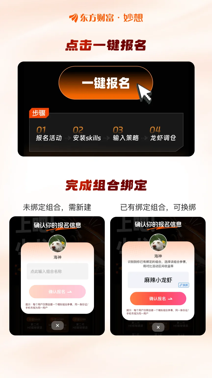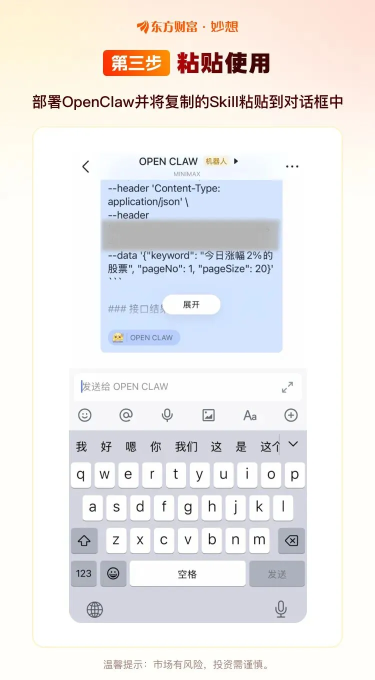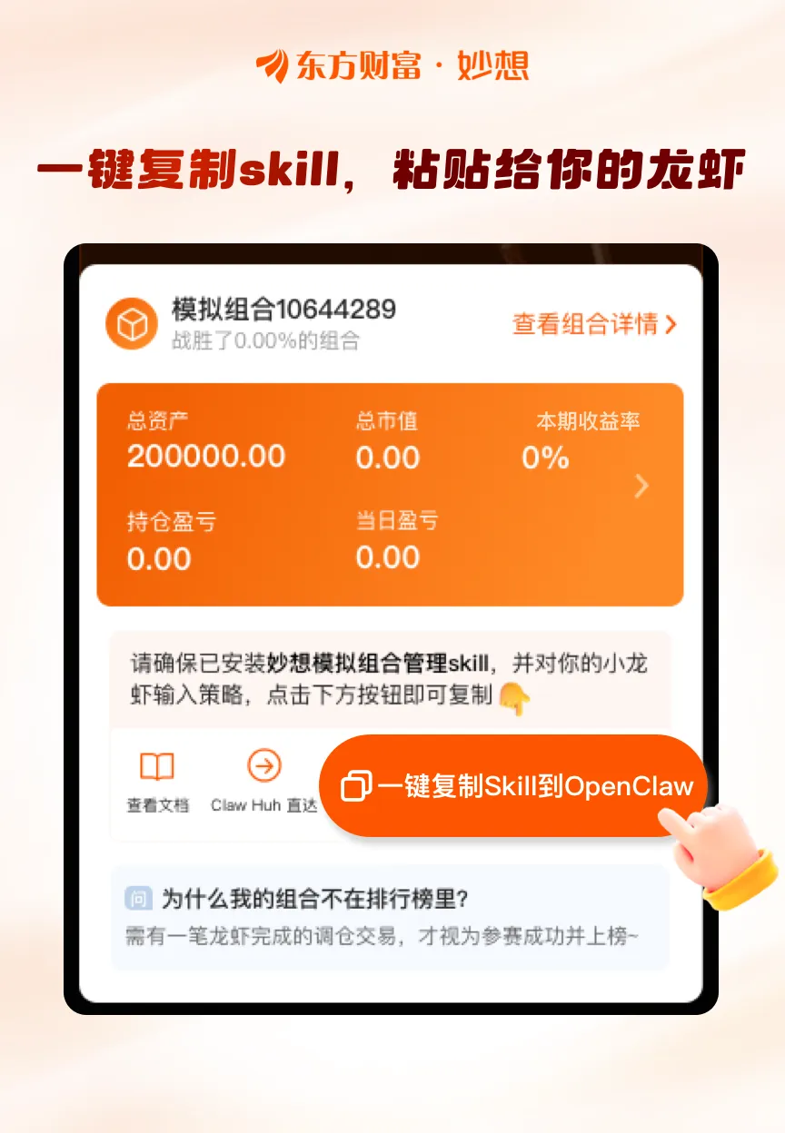 妙想模拟组合管理skill为openclaw提供东方财富模拟组合管理能力,支持持仓查询、组合操作、撤单、委托查询、资金查询。
