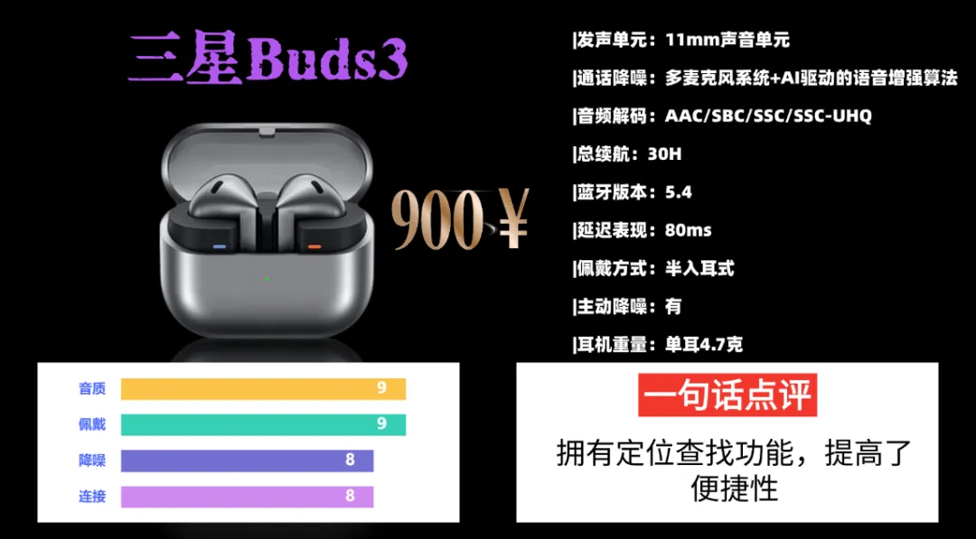 音质方面搭载11mm单个驱动单元,配合1.5倍增强的功放振膜,支持24bit/96kHz超高品质音频与SSC编解码器,可呈现录音室般的高解析度音频,低频扎实但不浑浊,中频人声清晰通透,高频延展自然无刺耳感,三频层次分明,适配流行、古典、播客等多种聆听场景。它与三 星设备深度适配,开盖即连、设备间切换迅速,可通过专属App自定义降噪强度、触控手势,非三 星设备也能完整使用蓝牙5.4连接功能。