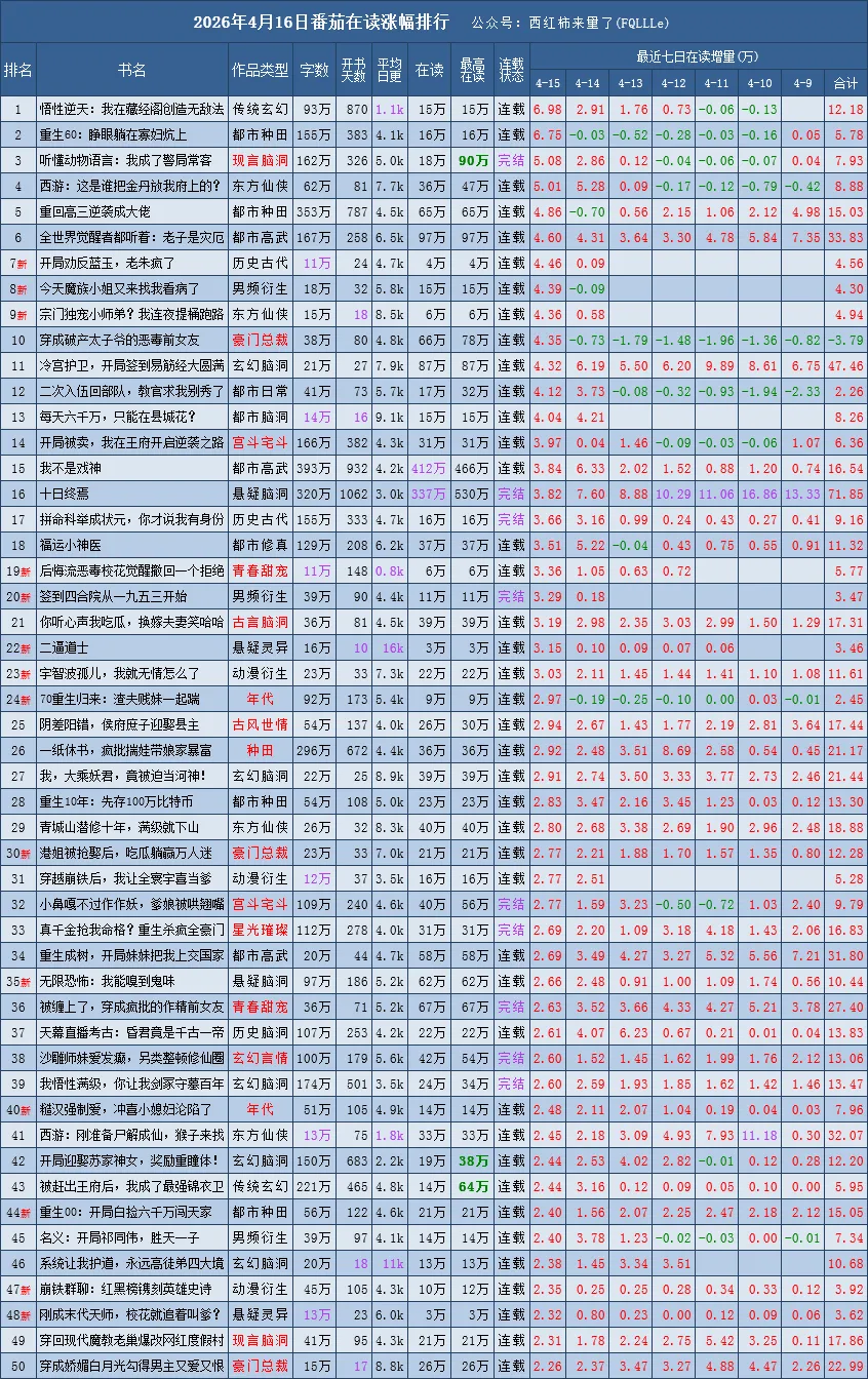最后的8列,为最近7日的每日在读变化,以及7日的累计涨幅
