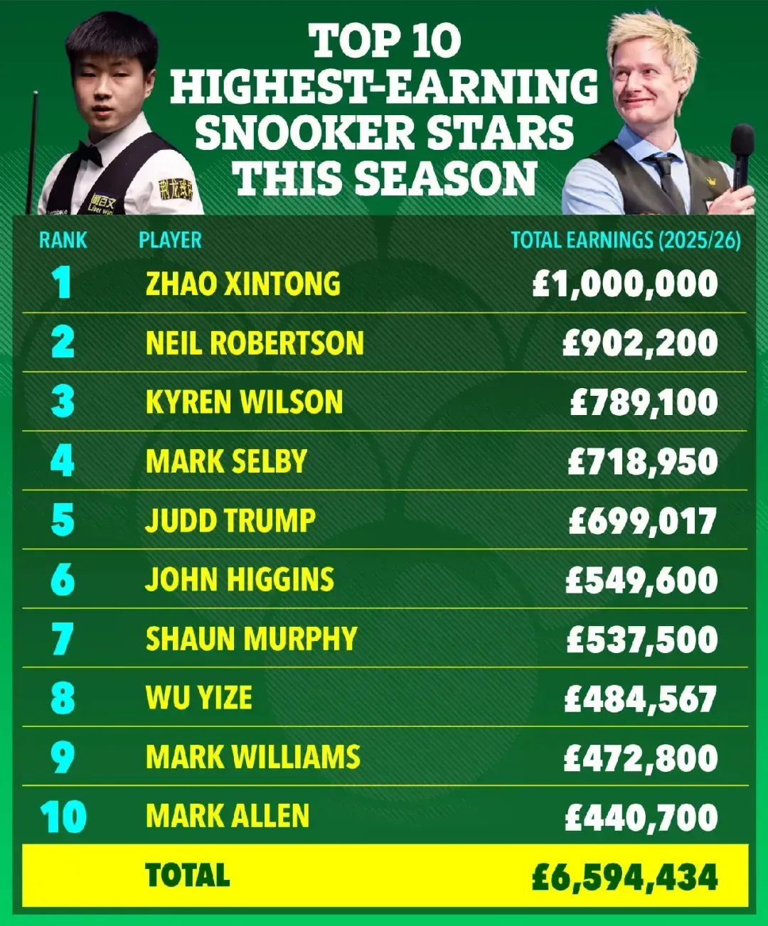 今天,2026年斯诺克世锦赛正赛大幕拉开,参赛选手将为高达50万英镑的冠军奖金展开角逐。英国媒体《太阳报》近日盘点了截至世锦赛开赛前,2025-2026赛季斯诺克奖金收入排名前十的选手,中国选手赵心童以100万英镑位列榜首,另一名中国选手吴宜泽也榜上有名,位列第八。