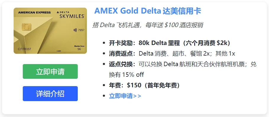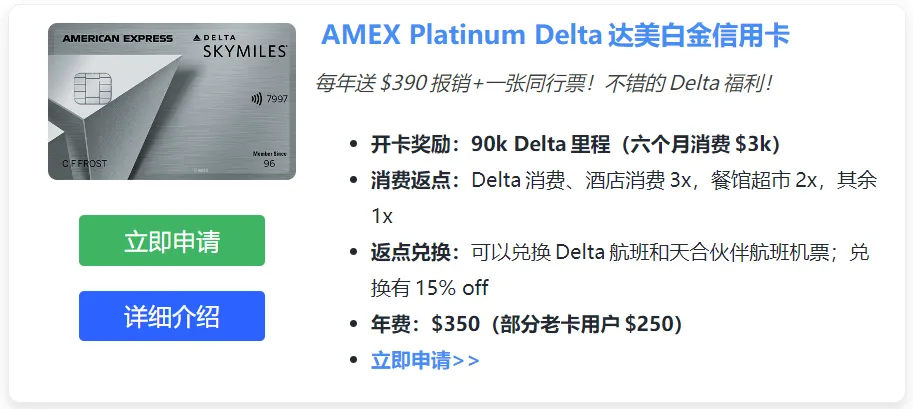 - 如果有更高的追求,平时坐 Delta 比较多的,可以考虑这张 Platinum。注意,如果你还没拿过 Gold,建议先 Gold。因为 Platinum 拿过就不能拿 Gold 奖励了