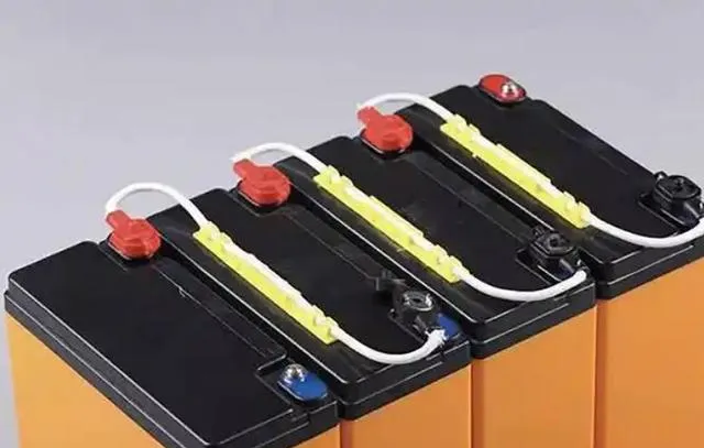 最后这张图更有意思。几块电池排成一排,外壳是橙色边框配灰色面板,顶部有蓝色和红色的接线标识。这种配色一看就跟前面几张不一样,估计是另一个品牌或者另一个系列的产品。