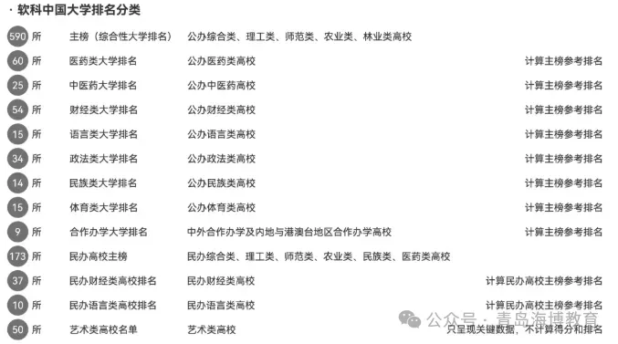 “2026软科中国大学排名”的最终排名对象共计1086所,其中公办大学842所、民办高校235所、中外合作办学及内地与港澳台地区合作办学9所。“2026软科中国大学排名”设置了1个主榜(综合性大学排名)、7个单科性大学排名、4个非公办高校排名,以及艺术类高校名单,1086所高校根据学校性质和学校类型被分别纳入到其中一个对应的排名或名单中。
