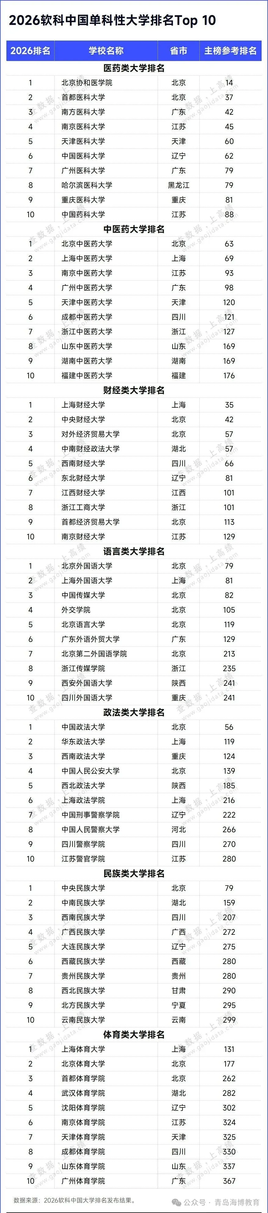 2026软科中国大学排名遵循分类排名的原则,对单科性大学使用差异化指标体系分别进行排名。其中,北京协和医学院蝉联医药类大学排名榜首,北京中医药大学摘得中医药大学排名桂冠,上海财经大学位列财经类大学排名之首,北京外国语大学占据语言类大学排名第一,中国政法大学问鼎政法类大学排名冠军,中央民族大学高居民族类大学排名首位,上海体育大学持续领跑体育类大学排名。