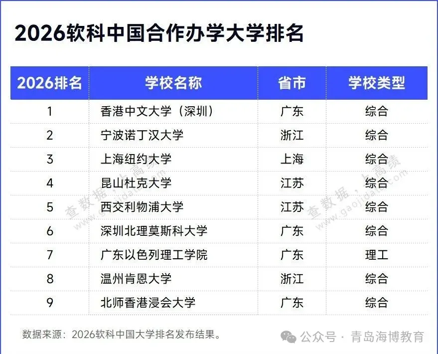 2026软科中国合作办学大学排名的对象有9所,香港中文大学(深圳)、宁波诺丁汉大学、上海纽约大学位列前三。