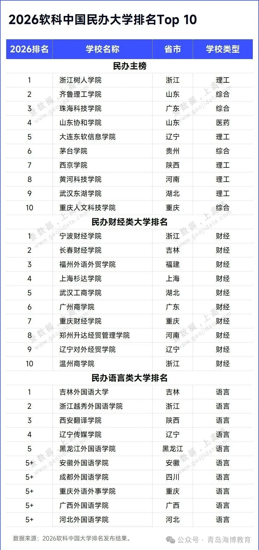 民办高校分为民办高校主榜、民办财经类高校排名、民办语言类高校排名3个榜单。其中,浙江树人学院居民办高校主榜榜首,齐鲁理工学院、珠海科技学院位于民办高校主榜全国前三。此外,宁波财经学院和吉林外国语大学分别位列民办财经类大学和民办语言类大学排名第一位。