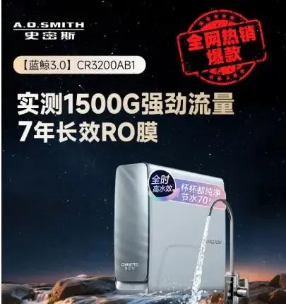 产品优势:史密斯佳尼特专注净水领域,核心优势在于长效耐用与品质可靠,蓝鲸1200G CR3200AB1款,1200G大通量出水流畅,7年RO膜长效耐用,厨房台下专用设计节省空间,直饮一体机设计无需额外设备,过滤精准、出水纯净可直接饮用,操作便捷、维护省心,品控严格、运行稳定,作为冠军之选,兼顾实用性与耐用性,适配各类家庭。