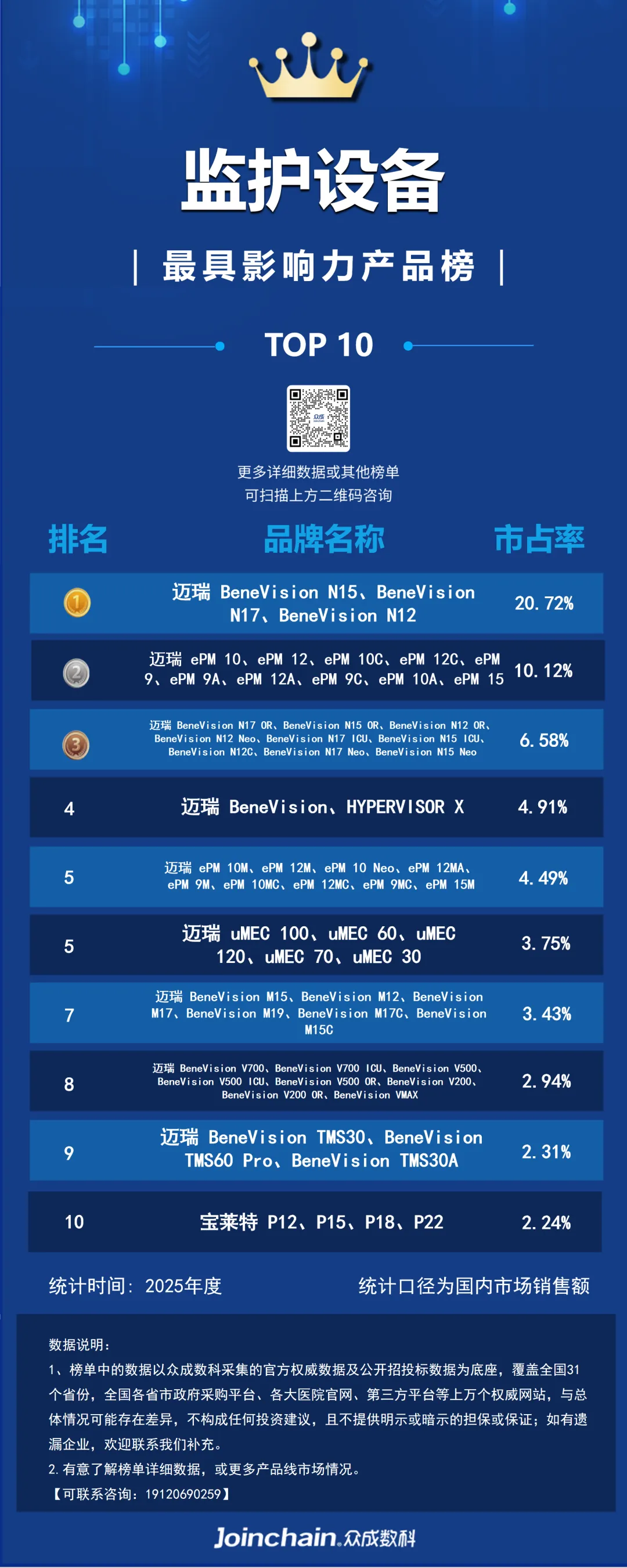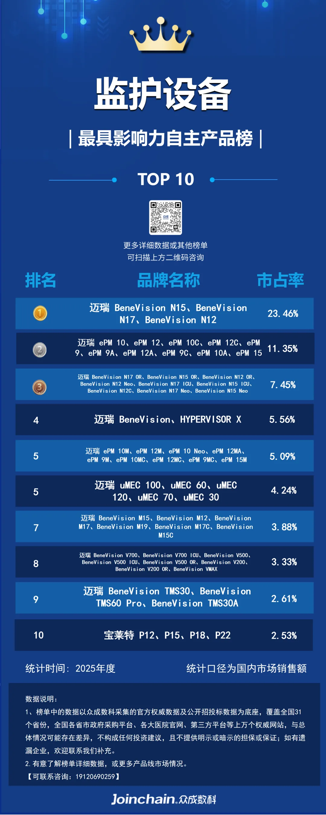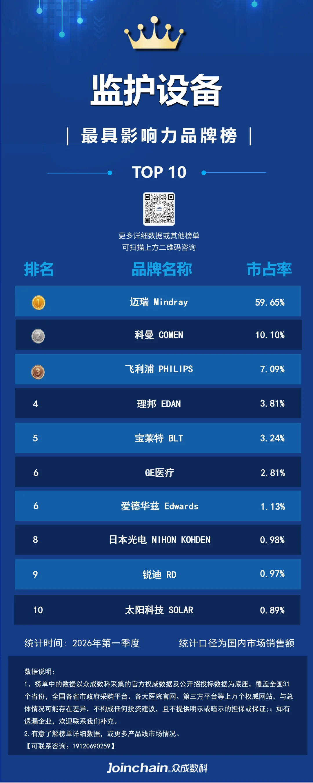 2026年第一季度监护设备最具影响力自主品牌榜(按照销售金额)
