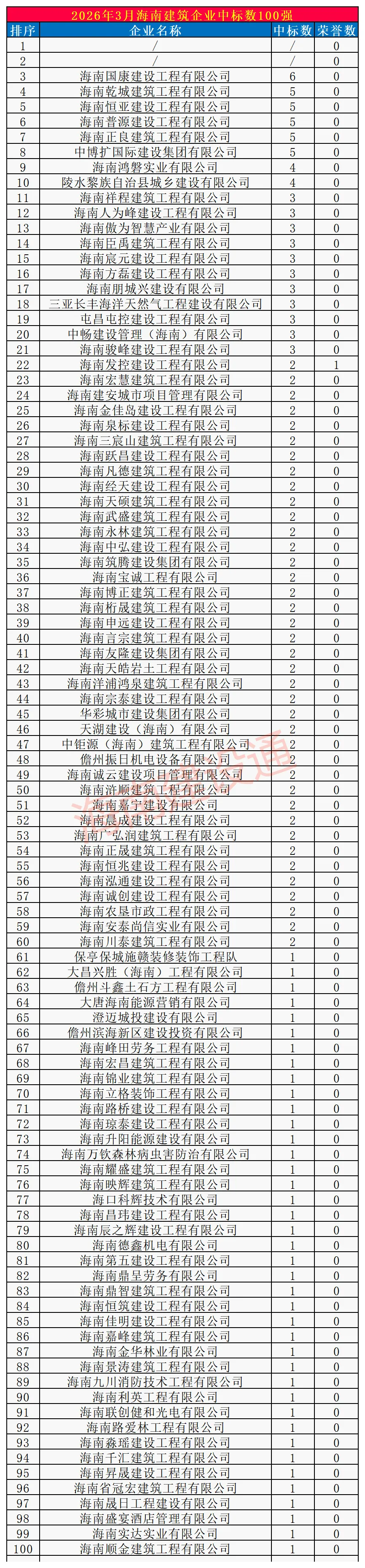 来源:CBI建筑网,数据统计时间段:2026年3月1日-3月31日CBI建筑网综合报道:在2026年3月,海南省建筑施工企业中标数量达811,环比(与上个月相比)上升38.7%,同比(与去年同期)上升2.66%。来源--建设通 PS:本次数据统计来源于全国各省市建筑交易中心类网站所发布的中标通知书,信息来源真实、有效。但由于少部分建筑交易中心未被发现,或少量工程项目要求联合体投标被重复统计,可能导致本次统计数据出现一定误差。