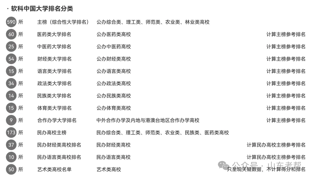 由于中国高等教育体系的特点,为保证高校之间的可比性和比较的公平性,“2026软科中国大学排名”设置了1个主榜(综合性大学排名)、7个单科性大学排名、4个非公办高校排名,以及艺术类高校名单,1086所高校根据学校性质和学校类型被分别纳入到其中一个对应的排名或名单中。