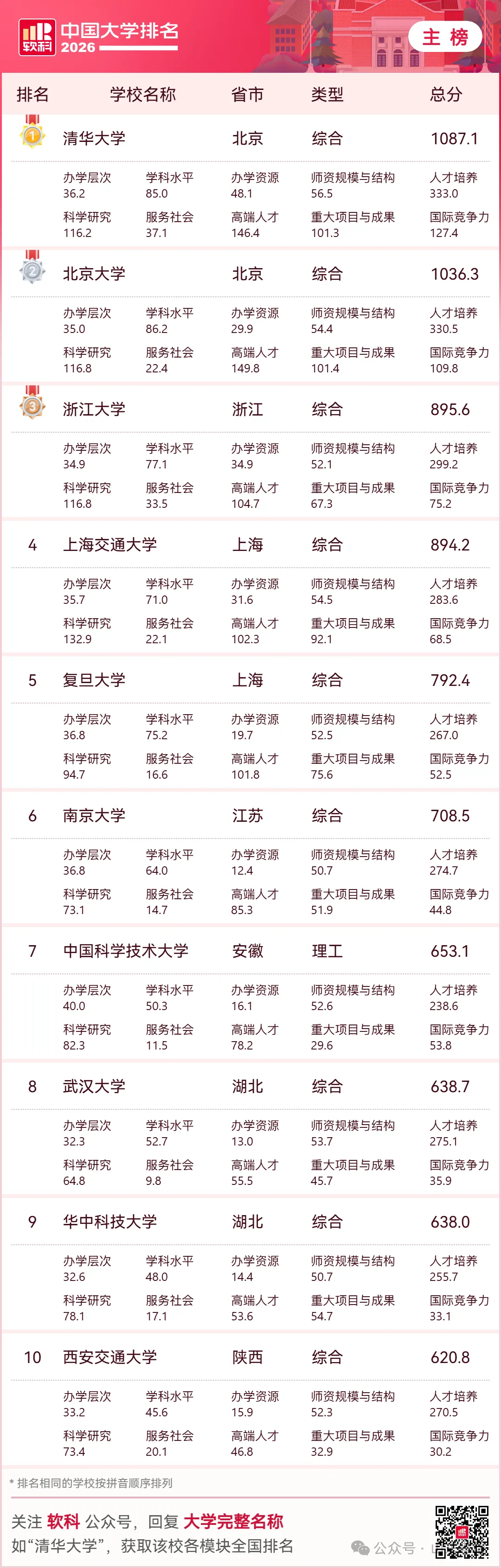 “2026软科中国大学排名”的最终排名对象共计1086所,其中公办大学842所、民办高校235所、中外合作办学及内地与港澳台地区合作办学9所。