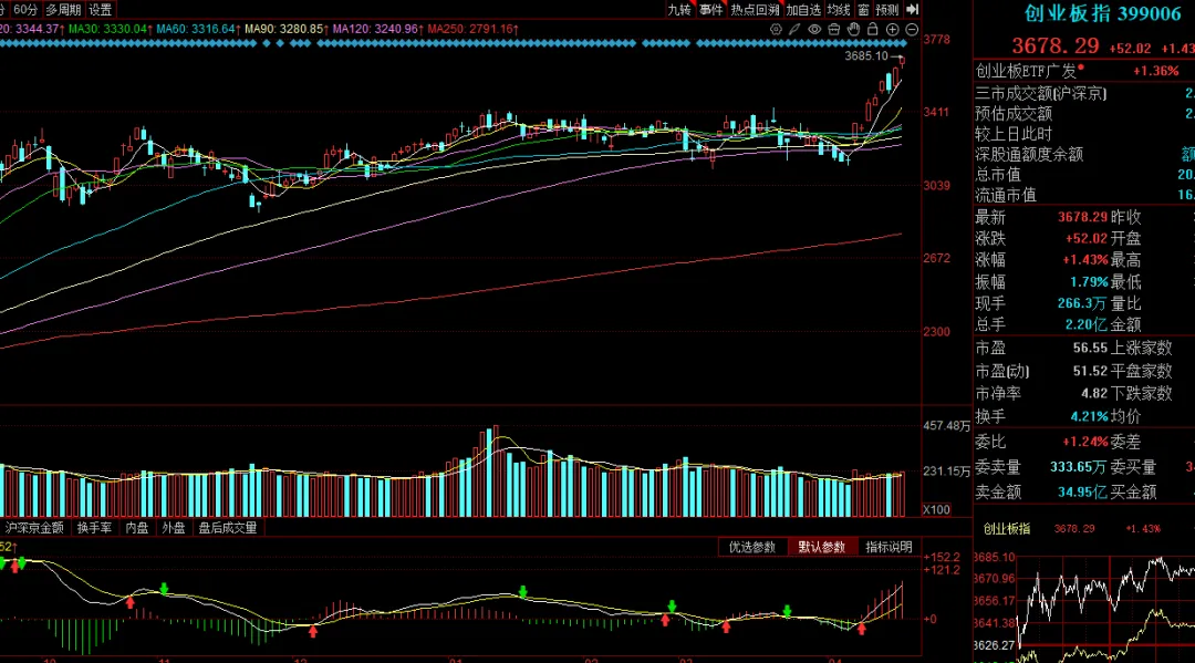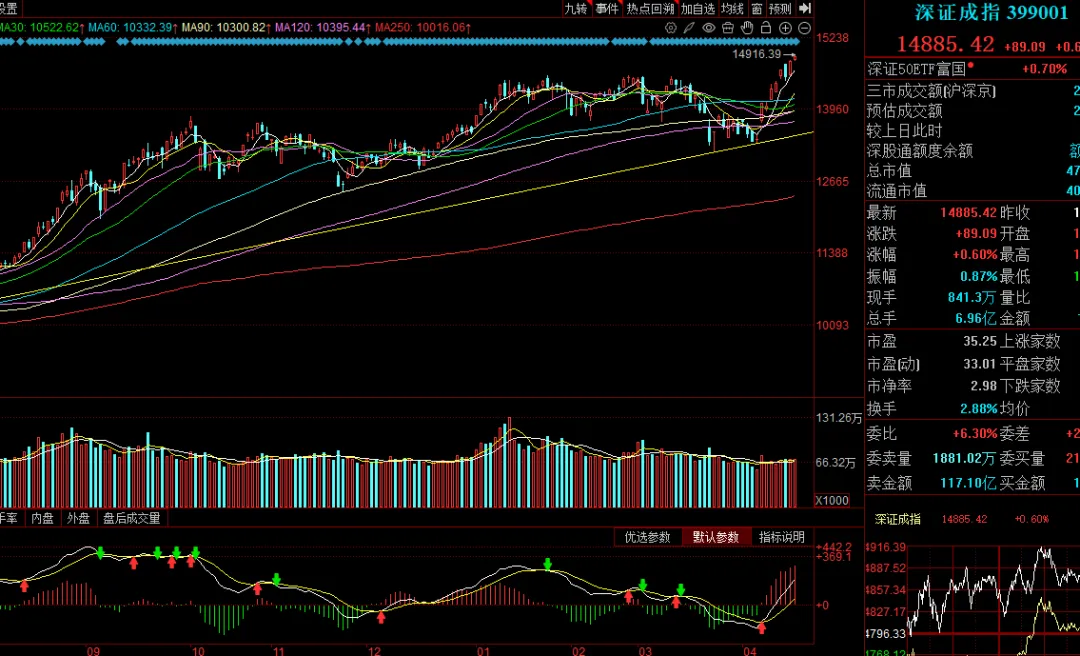 再看深成指,深成指不仅反弹强劲,还创出了新高,MACD趋势良好,
