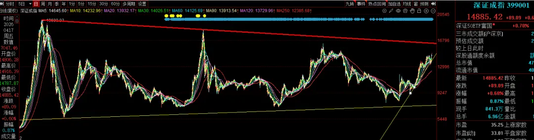 从长期来看,深成指离长期阻力线还远,这轮牛市从长线来看,深市涨的比沪市要慢,但从近期中短期来看,深市涨的比沪市要快,因此,后半程重点仓位应该在深市